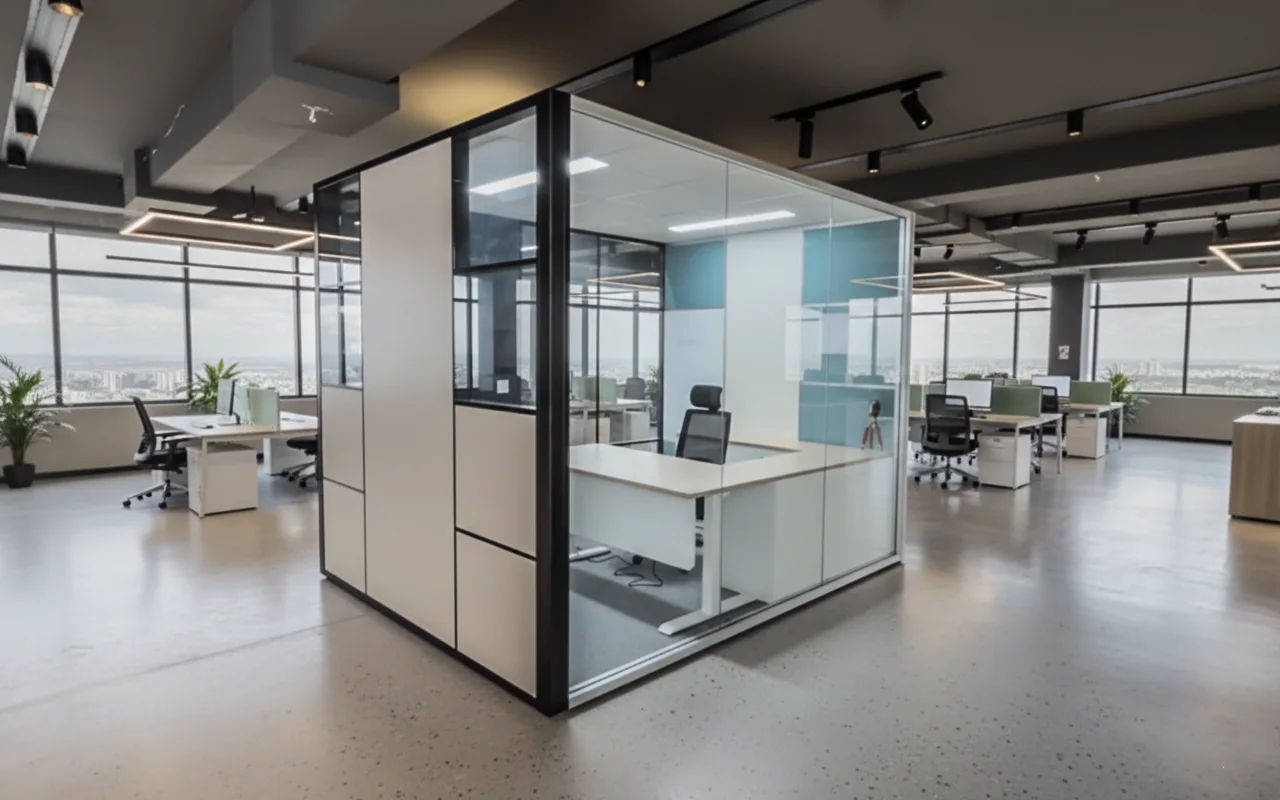 A demountable modular cabin is a pre-fabricated workspace enclosure that can be assembled, dismantled, relocated, or reconfigured without civil construction. It provides privacy with premium aesthetics inside open office spaces.