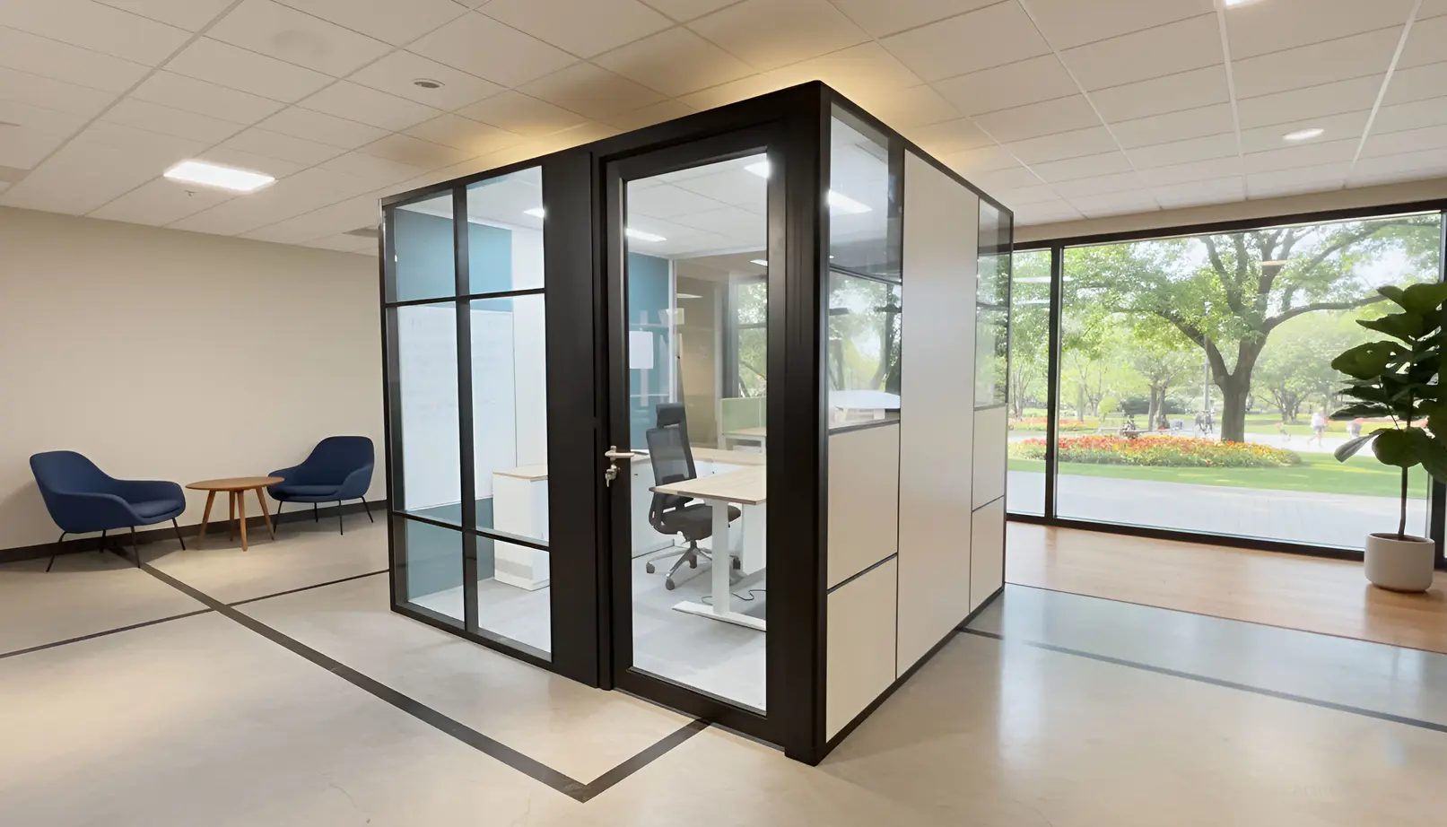 A Demountable Modular Cabin is a pre-engineered, easy-to-install workspace enclosure that offers privacy and flexibility inside open-plan offices. Built with high-performance glass, metal, and acoustic panels, these cabins can be assembled, relocated, or reconfigured without damaging the existing space.